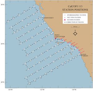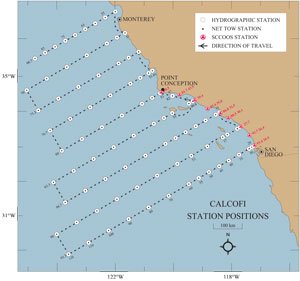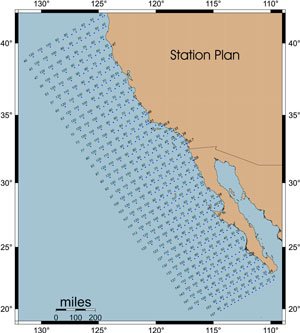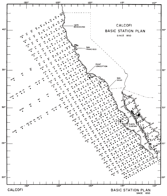 | The original CalCOFI pattern from 1950 covered the entire west coast of US and Baja California. This required 2 or more ships sailing for 30 or more days. | |