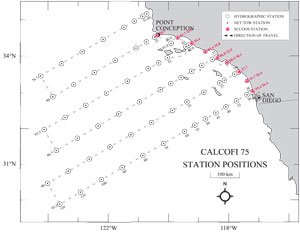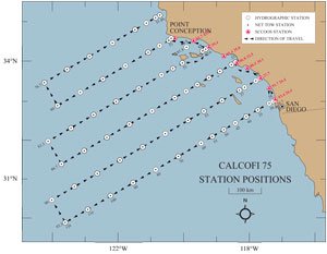 | 75 Station Pattern is typical for summer & fall CalCOFI cruises or winter & spring cruises when shiptime is limited: 66 standard + 9 SCCOOS Stations | |