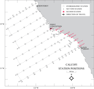 104 Station Pattern is typical for winter & spring CalCOFI cruises with less shiptime: 66 standard+ 29 northern + 9 SCCOOS Stations (station 100s are not occupied on lines 60-73) |