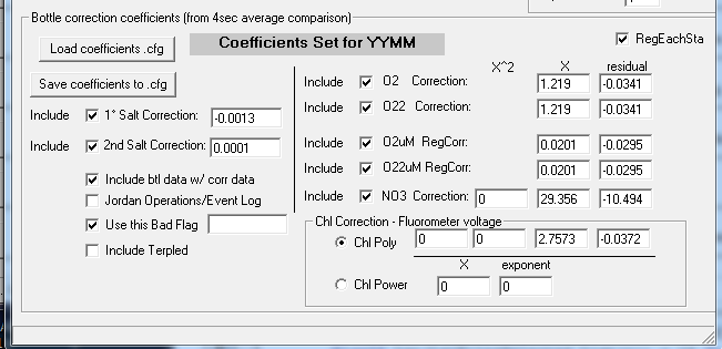 Step 2: Correction Coefficients - Replace the YYMM with the correct cruise designation by highlighting the YYMM in the Coefficients Set dialog. Check the appropriate boxes and enter the necessary coefficients for the required corrections. If a correction is not being made do not include and enter 0 in the necessary fields. Also "Include btl data..." and use the -9.990e-29 Bad Flag value to match SBE bad flags. Save the coefficient CFG to the cruise's CTD directory.