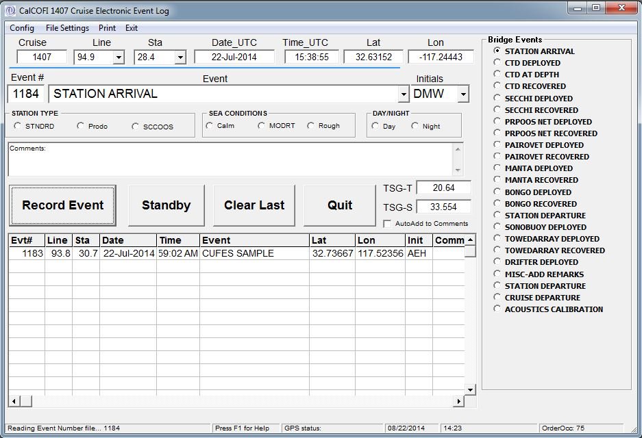 CELogGPS (CELogGPS1806.exe; download link) is a SIO-CalCOFI Windows program that records cruise events and activities timestamped with GPS date-time-lat-lon. Other notable events such as marine mammal-avifauna sightings, CUFES, or any data-generating activity may also be recorded. The GPS position is either logged directly into the PC running the program or is available on a shared network directory: