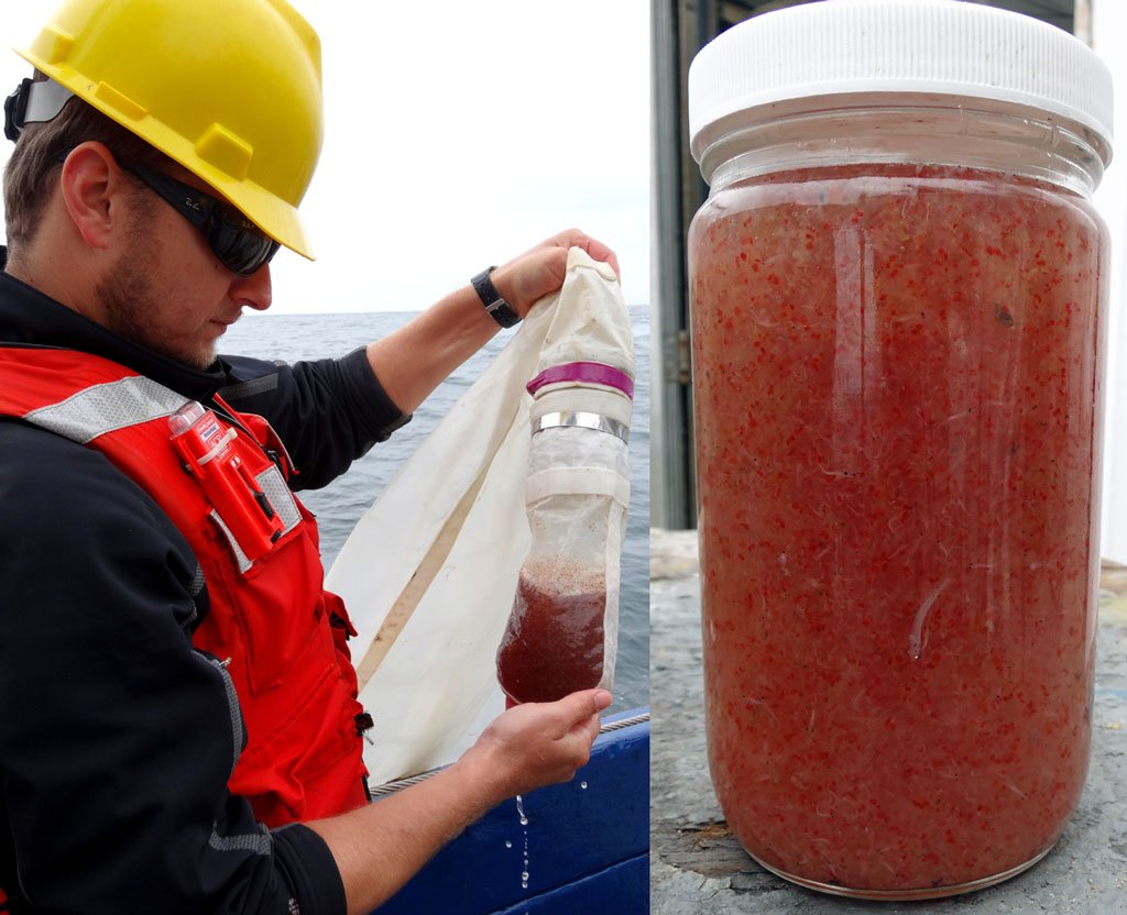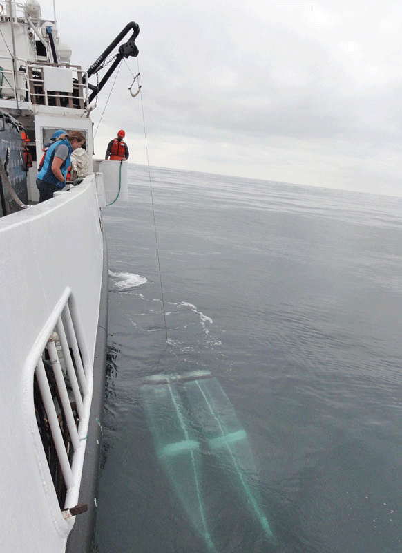 The bongo frame consists of two anodized aluminum circles that are 71 cm in diameter and has a 505 µm mesh net, 3 meters in length, attached to each side. The bongo is towed obliquely through the water column from 210 meters to the surface, while the ship is underway at 1-2 knots. While underway, a fixed amount of towing cable is paid out (300 m); the net is held at depth for 30 seconds and then retrieved at a constant rate (20 m/min). Ship speed is adjusted to maintain the towing cable at a constant angle to the vertical (45 degrees +/- 3 degrees). In shallow areas the amount of towing cable paid out is adjusted so the net samples approximately 15 m off the bottom. Starboard side the bongo sample is preserved in formalin and the port side sample is preserved in ethanol.